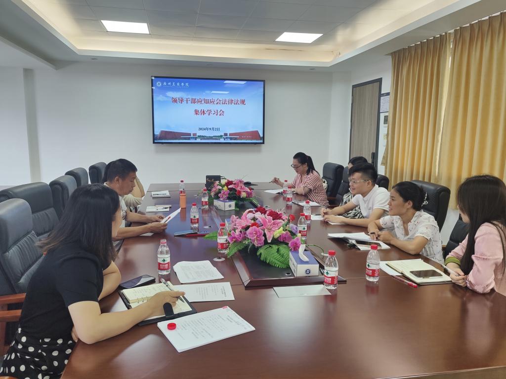 【本网讯】为贯彻落实“八五”普法的工作要求,进一步提升办公室干部职工的法治素养,鼓励引导教职工增强法律意识,营造尊法、学法、守法、用法的良好氛围,学校办公室于2024年9月2日在花都校区603会议室开展了领导干部应知应会法律法规专题学习会议。本次会议旨在普及法律知识,弘扬法治精神,推动干部职工以法治思维和法治方式依法履职,营造“人人重视、人人遵守”的良好氛围,进一步提高学校办公室依法行政水平。