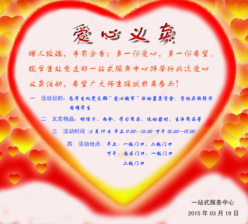 2015年3月19日,一站式服务中心将在一饭门口,二饭门口举行爱心义卖活动!欢迎各位亲们到现场挑选自己喜欢的东西!要想淘到好东西就要手快哦!!已经有一部分物品被买走了。但我们还会陆续加入部分物品,多来看看!只摆一天!
