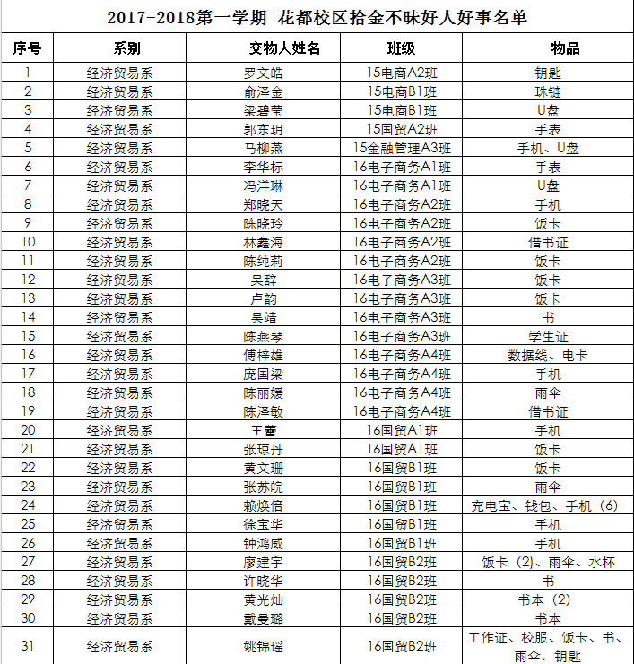 学院“以德为行,以学为上”的教育思想引导师生们以崇高的道德准则作为的行动指南,积极践行道德规范。一站式服务中心“失物招领”平台受到广大师生的支持,每学期都收到不少老师和同学交过来的失物,失物的及时上交使失主能及时领回自己的失物。“拾金不昧”的行为正是我院师生积极践行“以德为行,以学为上”良好体现,有助于文明和谐校园的建设。在此感谢上学期拾金不昧的老师及同学。(名单详见附件2017-2018学年第一学期拾金不昧名单)