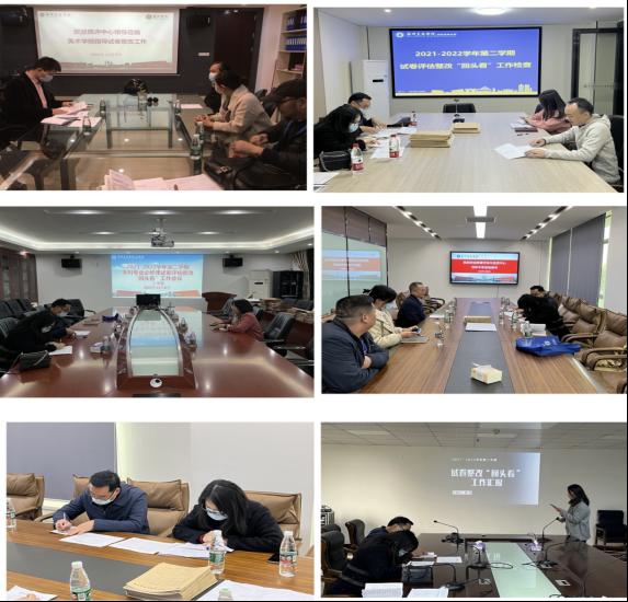 检查组分别走访了外语学院、美术学院、工学院、国际教育学院三部、国际教育学院一部、创新创业教育学院,听取了各教学单位关于试卷评估整改情况的工作汇报,并抽取了相关试卷材料进行复查。